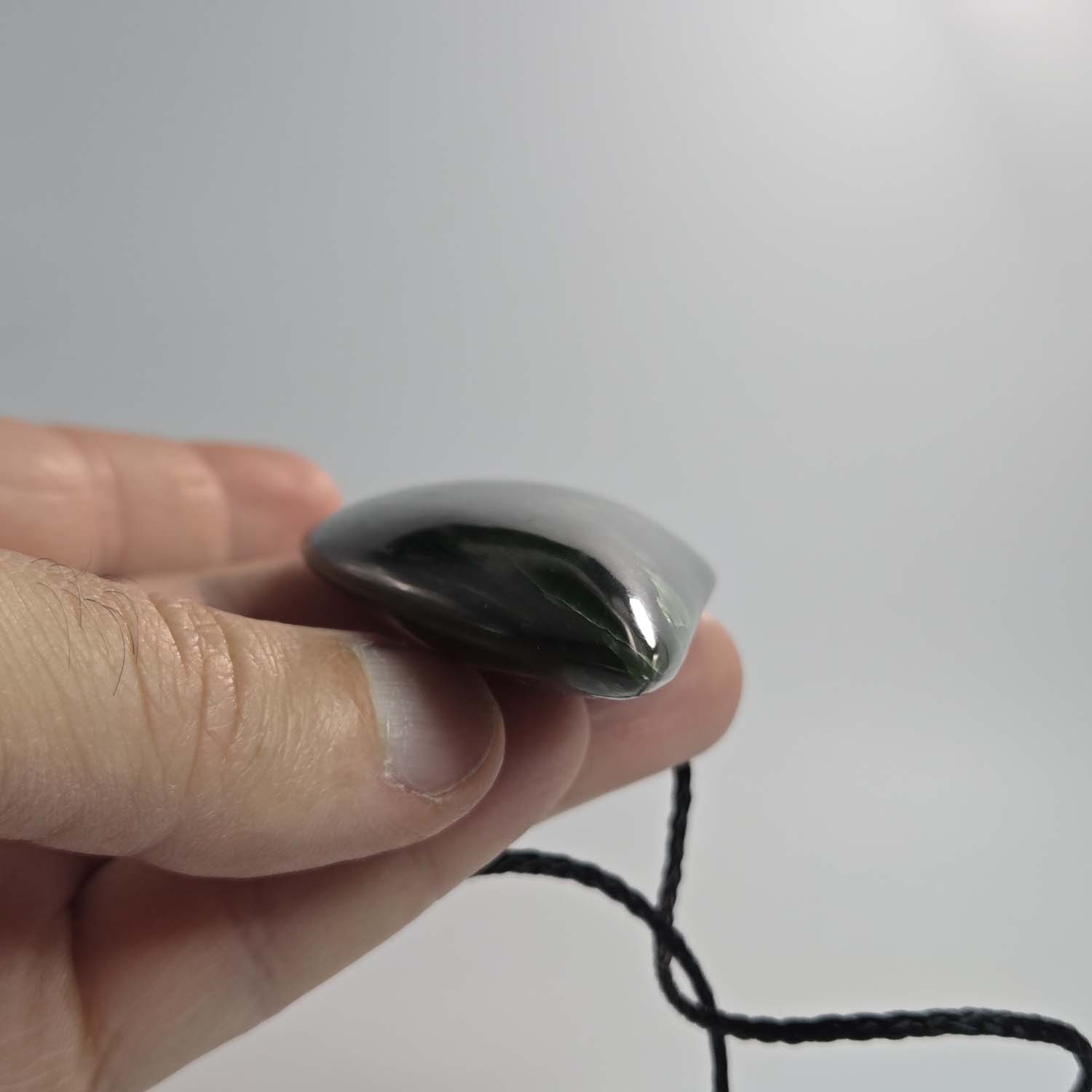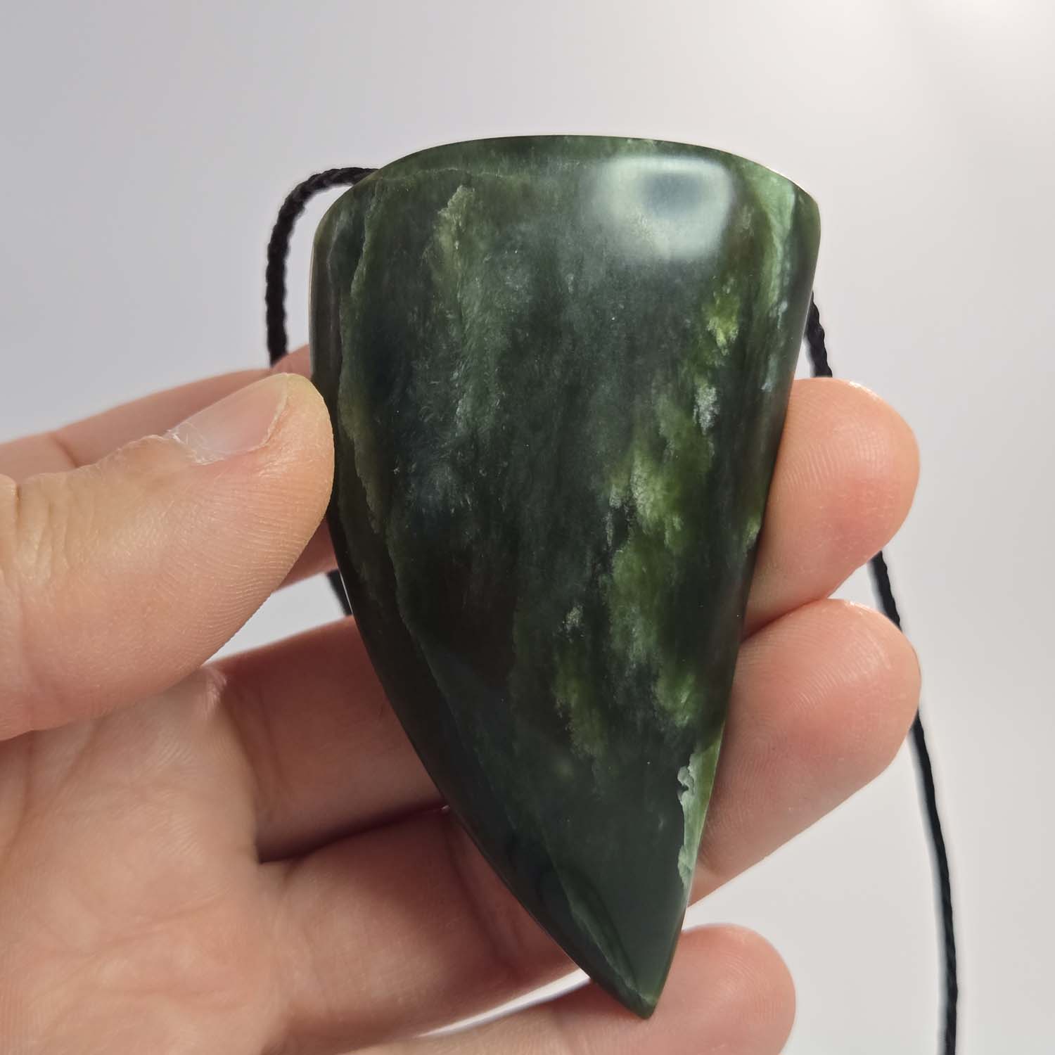 The stone itself is a striking piece of Kawakawa Pounamu, carved with generous depth that gives the taonga a strong, weighty presence. At 75mm long it has real presence when worn. Subtle cloudy patterning moves through the deep green stone, and the edges glow beautifully when held to the light.