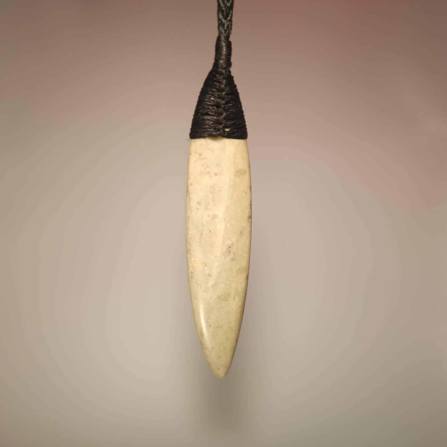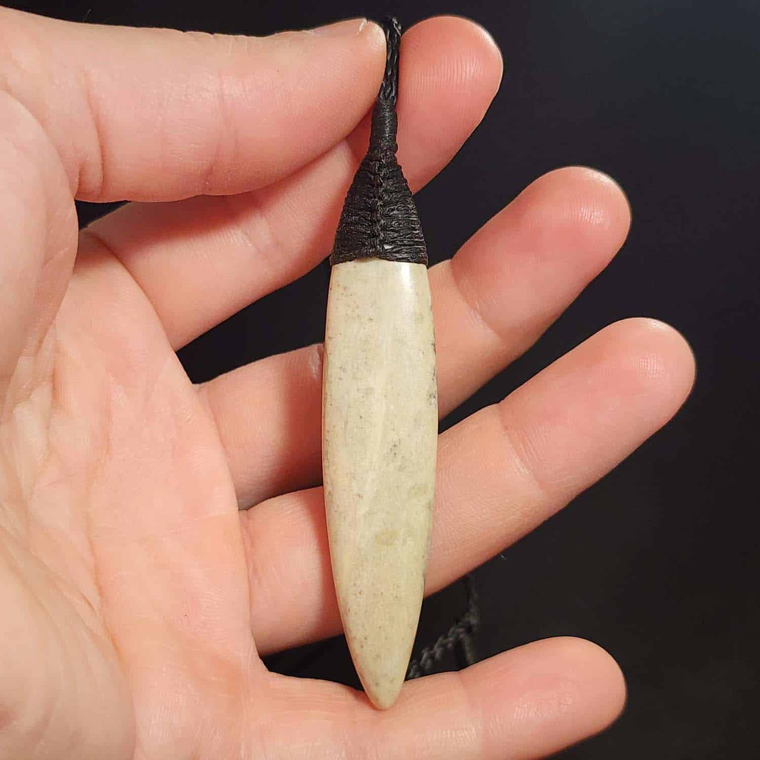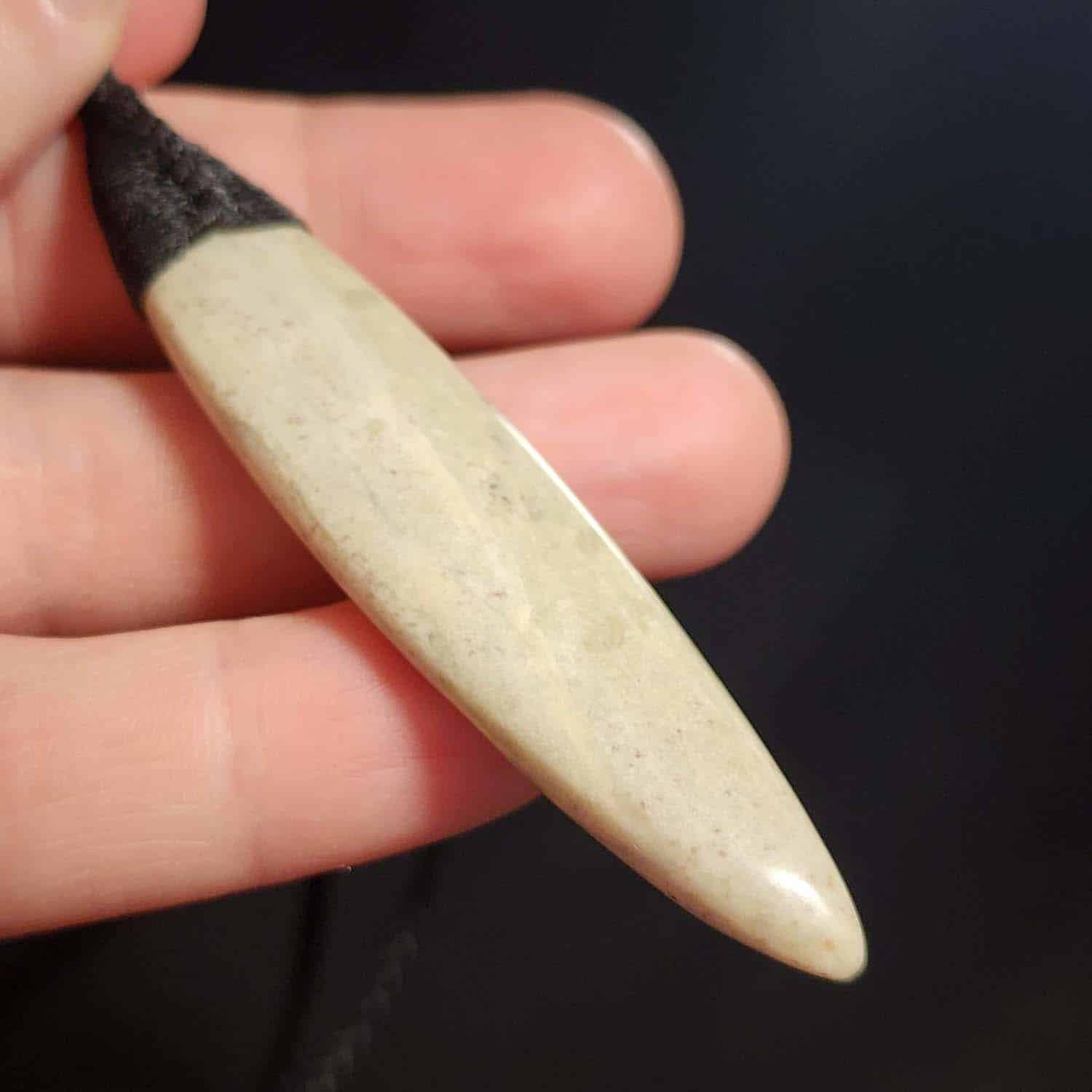 This piece is a 75mm Roimata, carved from the same creamy, pale-toned Pākohe as the Niho pendant. The stone has a soft, glowing quality that speaks of quiet strength and deep roots. It is finished with a black Roimata lashing and shaped with smooth, rounded curves from end to end. Tapered like a leaf or a sleek fish, this piece is all about flow.