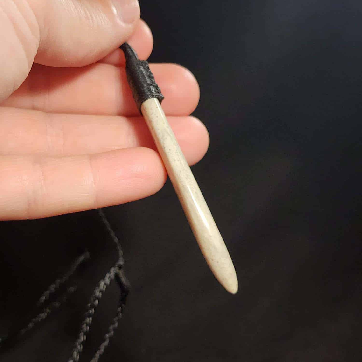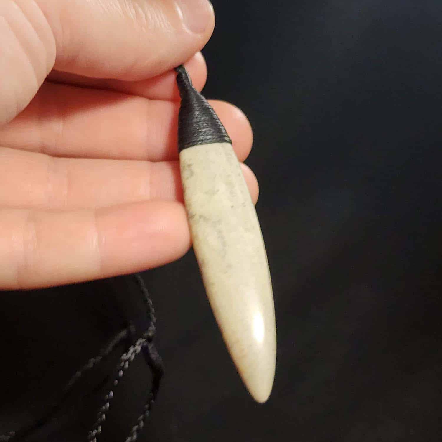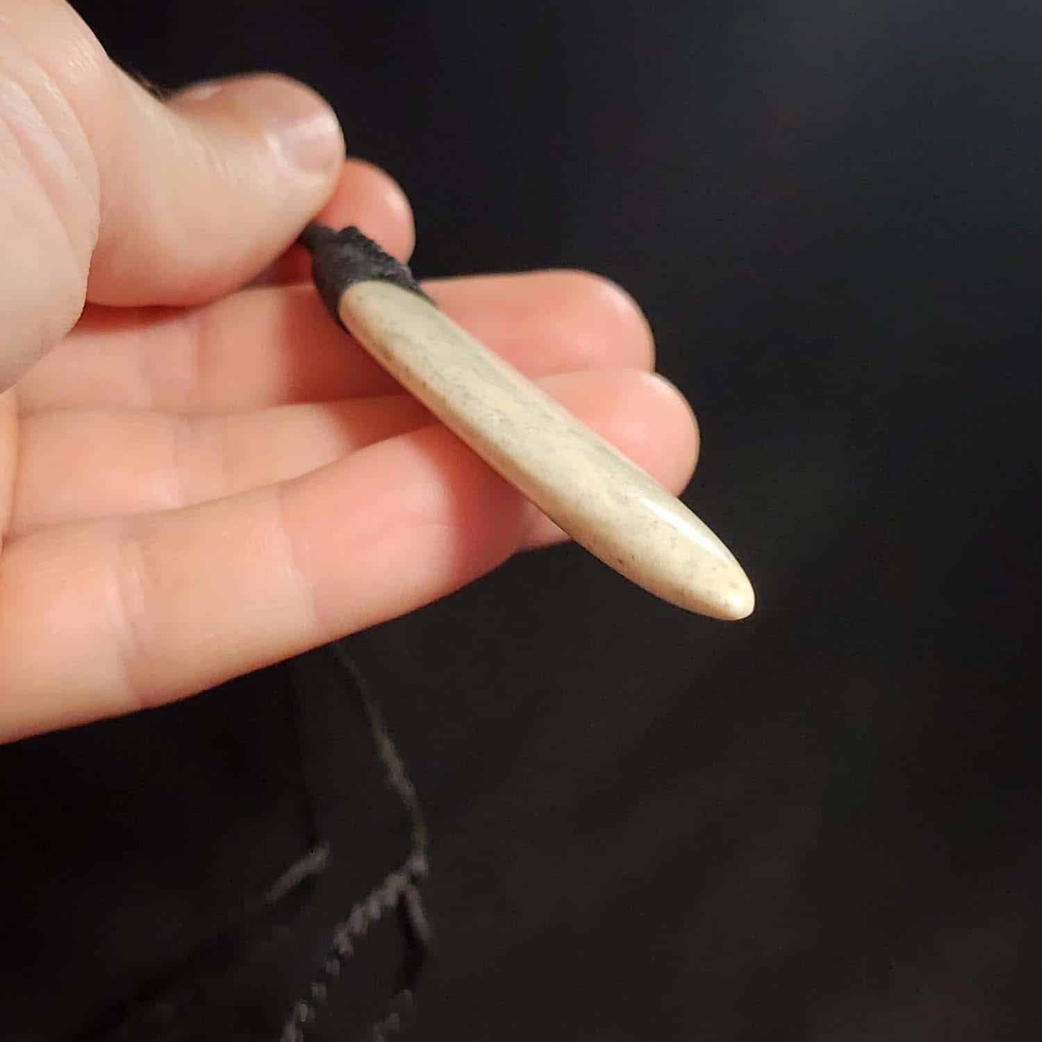 This piece is a 75mm Roimata, carved from the same creamy, pale-toned Pākohe as the Niho pendant. The stone has a soft, glowing quality that speaks of quiet strength and deep roots. It is finished with a black Roimata lashing and shaped with smooth, rounded curves from end to end. Tapered like a leaf or a sleek fish, this piece is all about flow.