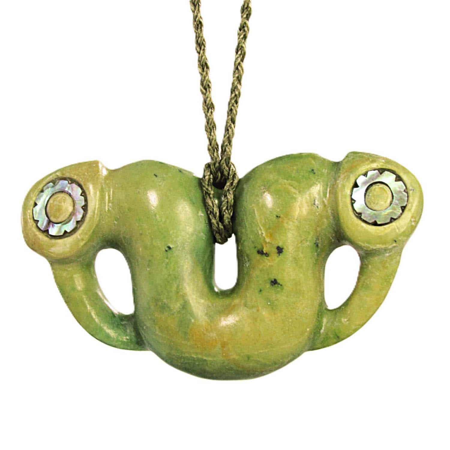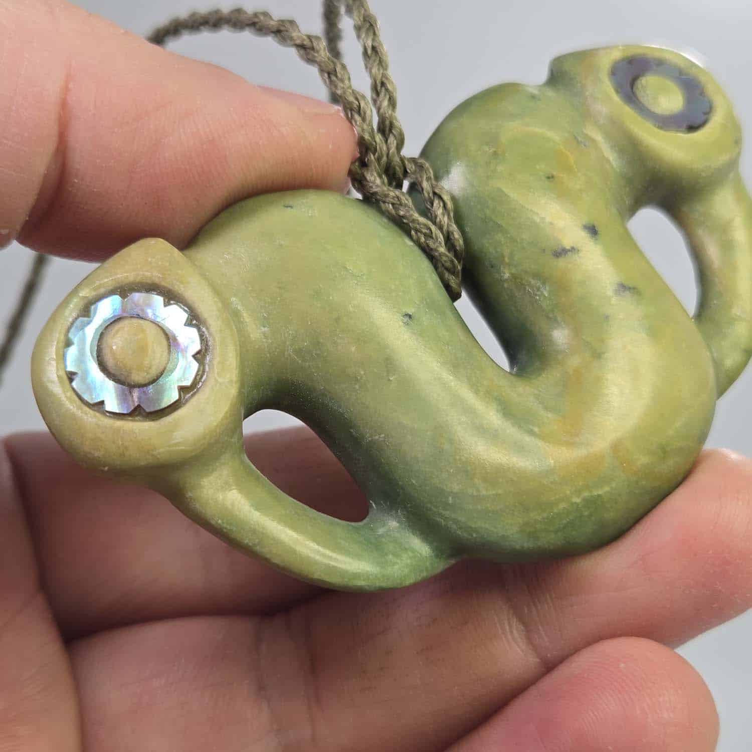 This taonga, named Pekapeka Kaitiaki, emphasises the protective nature of the design. Its bold pāua shell eyes glow with life, symbolising insight and watchfulness. Carved from Raukaraka Pounamu, the stone blends pale greens with a warm orangey-gold tinge from the rind, creating a unique and vibrant surface. At 80mm across, it has a strong presence, balanced by the harakeke-coloured cord that connects it to the natural world.