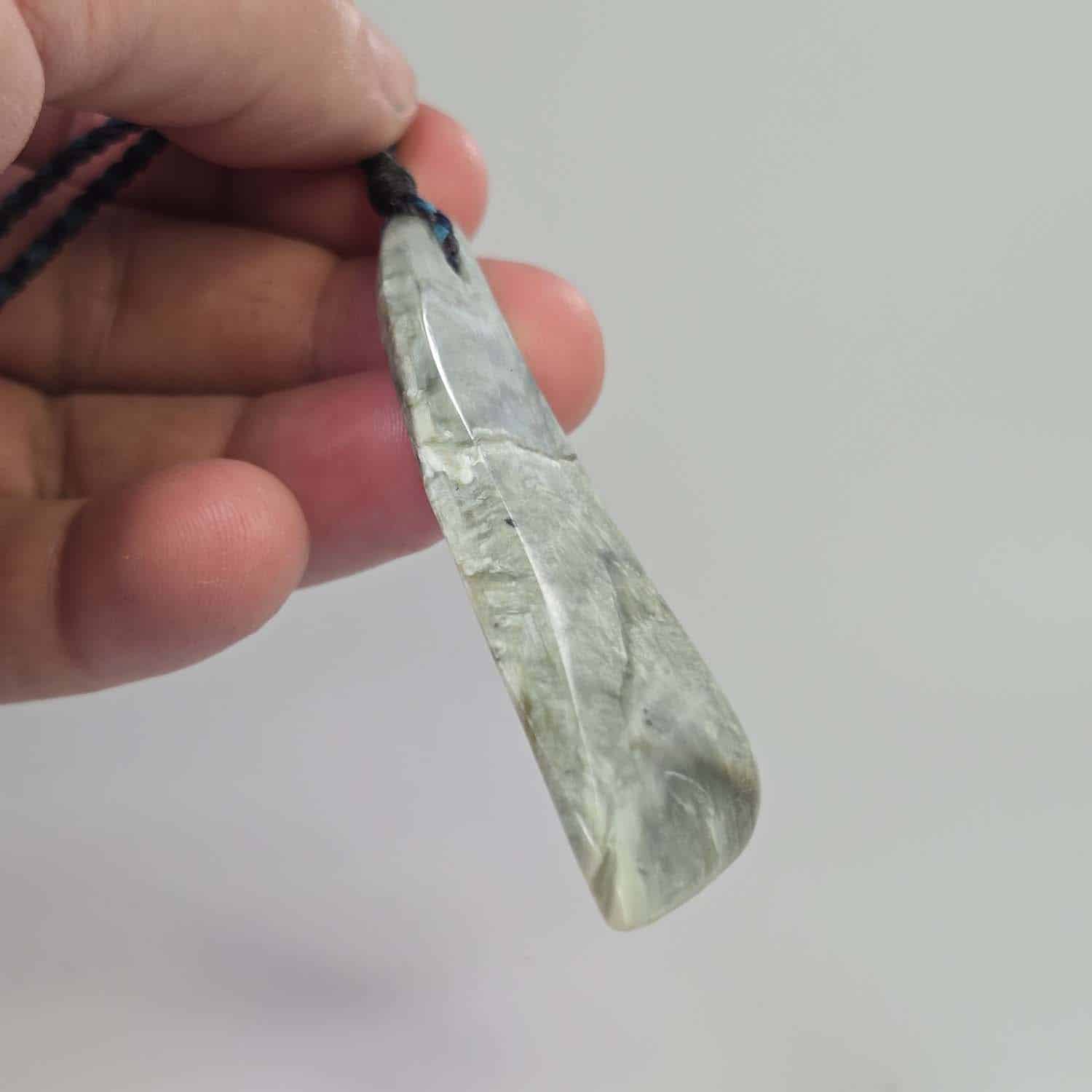 This piece is carved from an extraordinary type of Tangiwai Pounamu from the Piopiotahi (Milford Sound) region. While not the classic glassy Tangiwai many people recognise, this stone is something far more unique. The internal fibres run in aligned patterns, creating a natural chatoyancy that shifts and shimmers as the pendant moves. Soft whites and very pale greens flow through the stone, giving it a calm, subtle beauty.