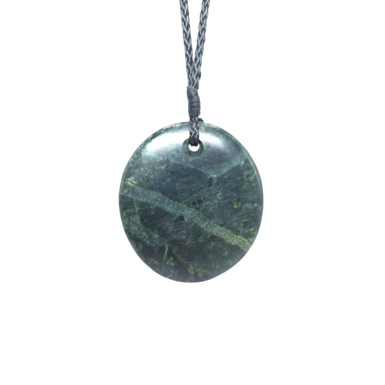 Suspended from a single, simple hole on a black cord, this taonga is understated in its design but bold in its symbolism. A piece that carries meaning in its shape and in the natural story within the stone.