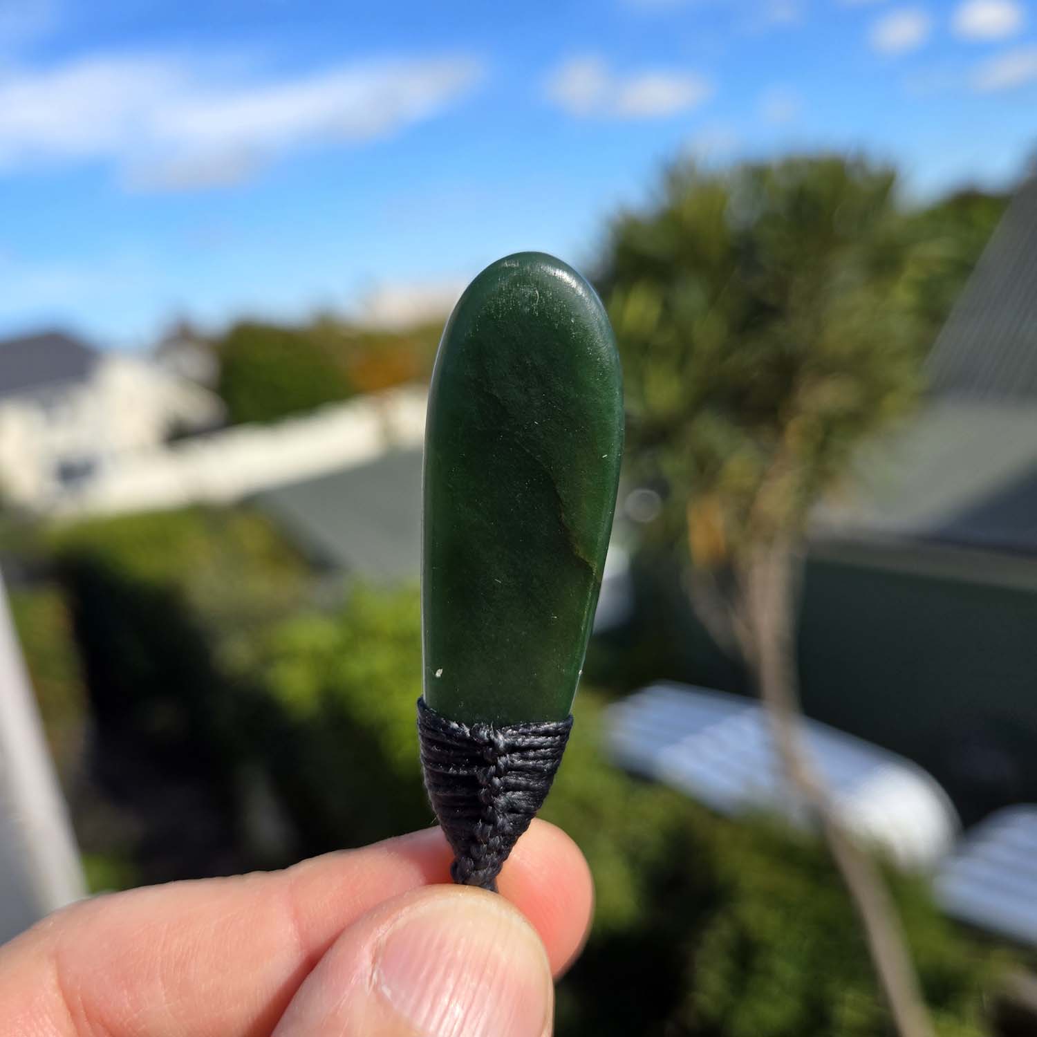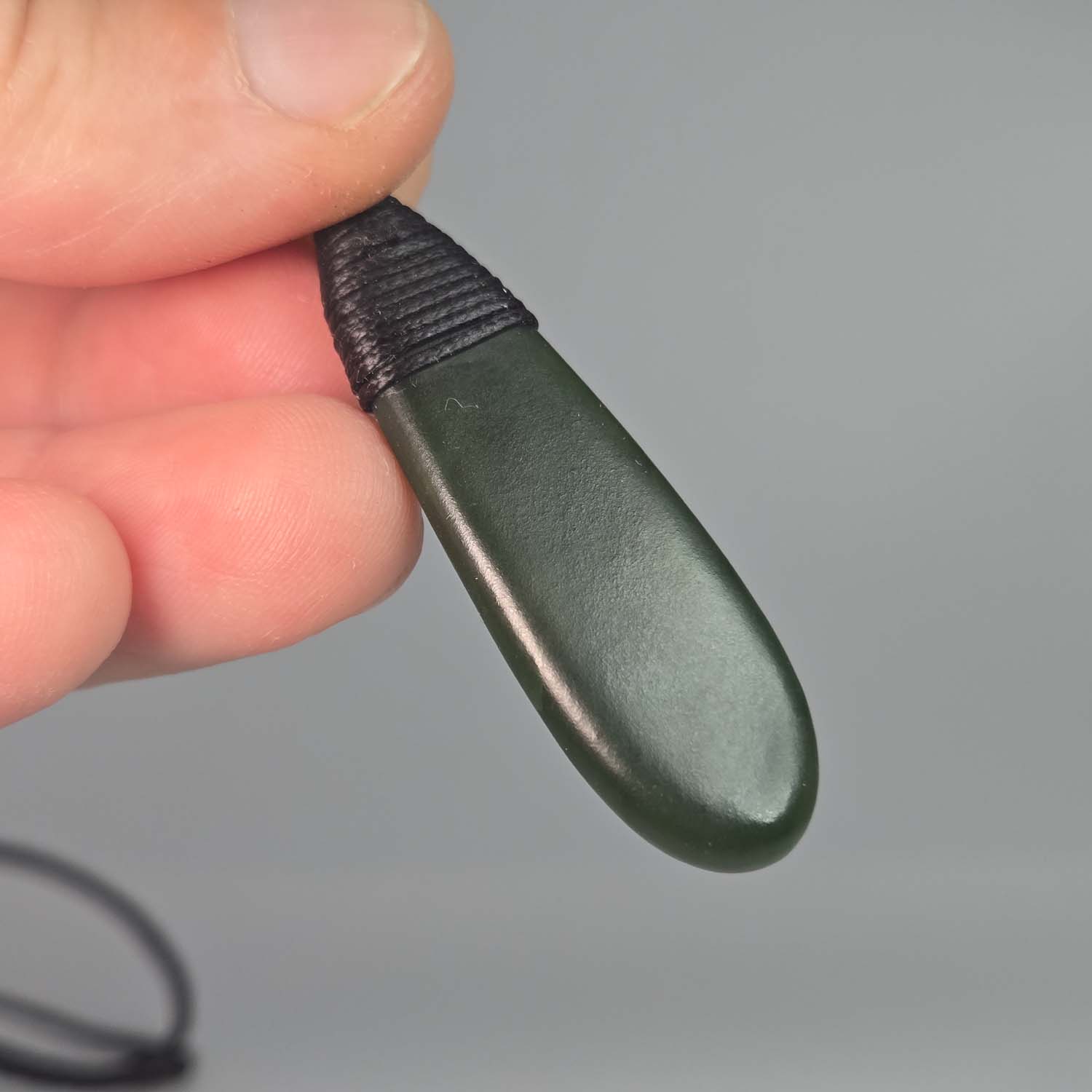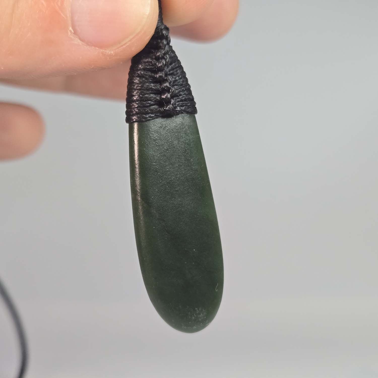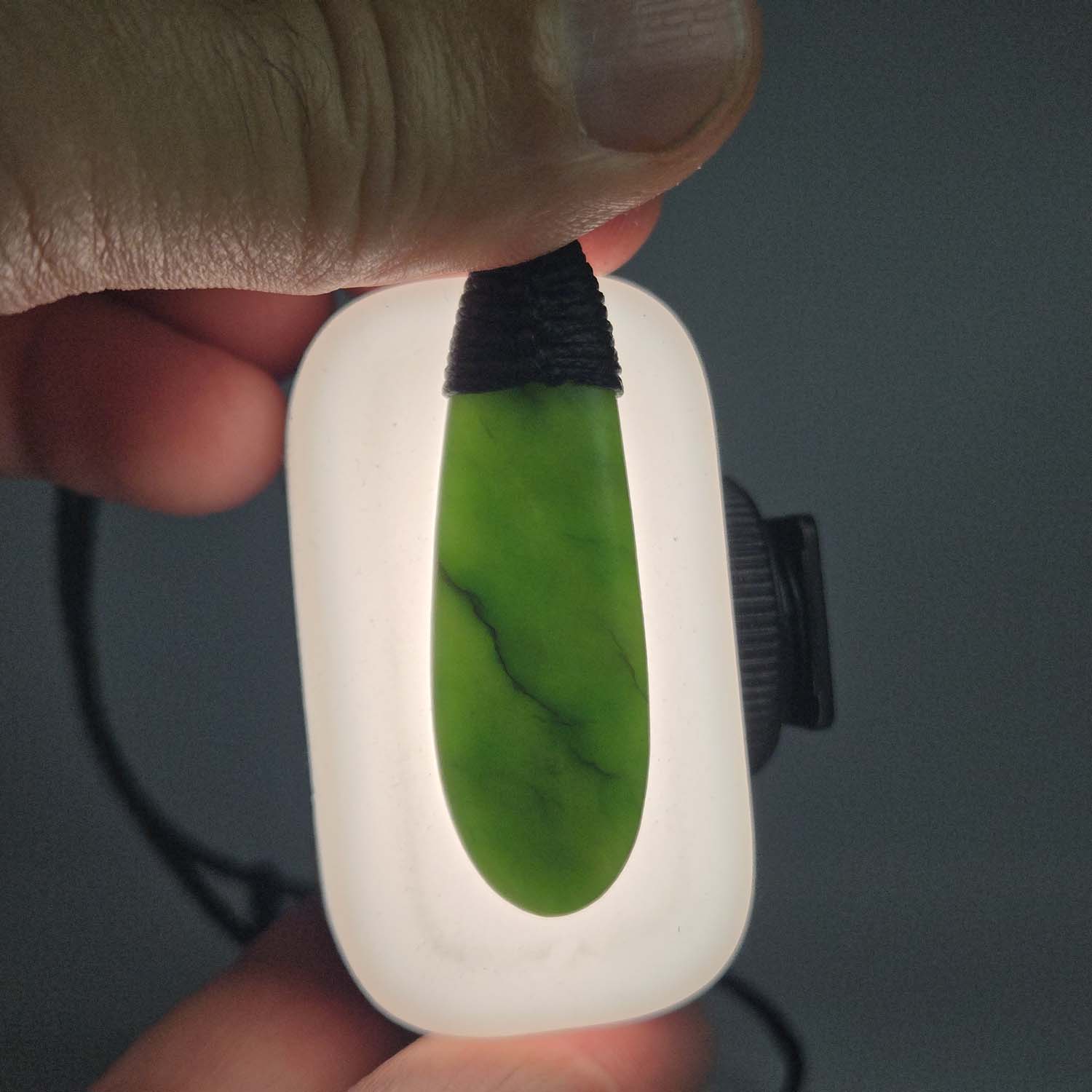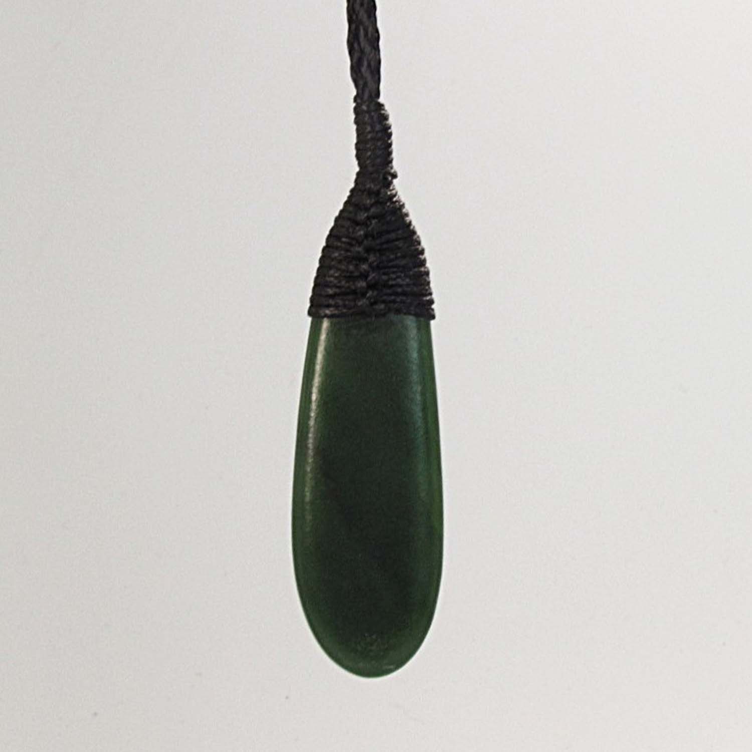 A small and elegant Pounamu Roimata pendant, 50mm long, with soft rounded curves and a clean flat face on both sides. When held up to the light the stone reveals beautiful internal patterns and translucency, giving the taonga a living depth. It is finished with a traditional black roimata lashing, making it ready to wear.