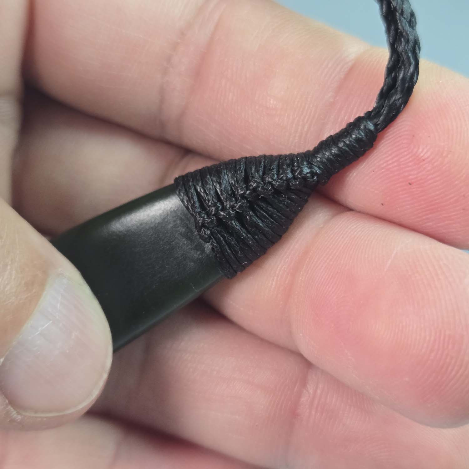 The pendant is finished with a black roimata lashing that complements the colour of the stone and allows it to sit naturally when worn. This is a unique hand-carved piece of Pounamu, shaped to highlight the natural beauty and internal life of the stone.
