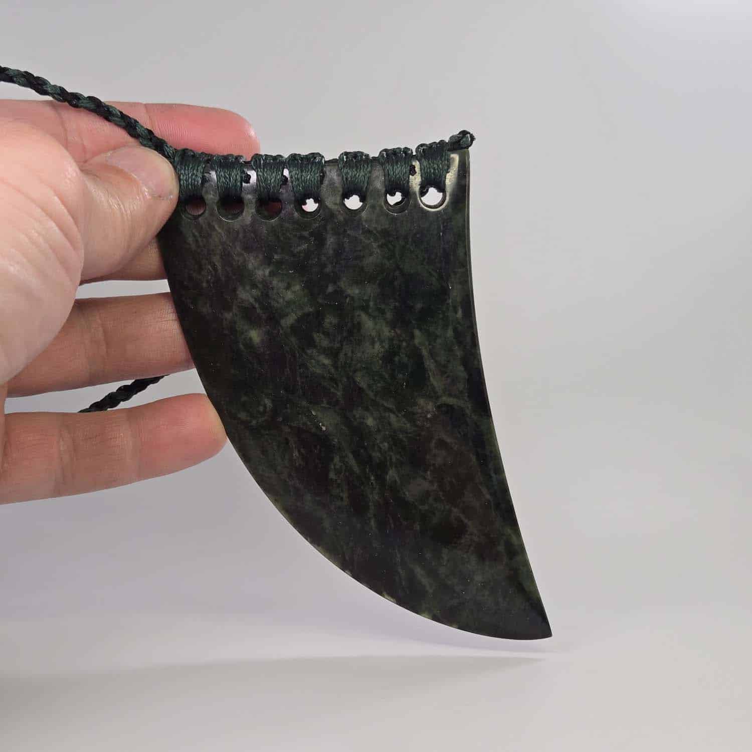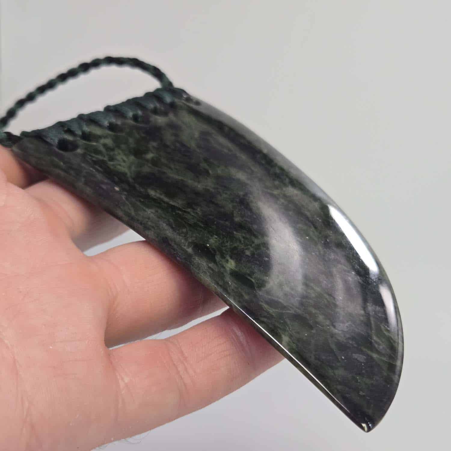 A large Niho carved from TÄkiri/Douglas Creek Pounamu. This 11cm piece has a bold curving tooth shape, a seven-hole ring-bolt lashing, and a deep forest-green and black braided cord. The toggle is carved from the same Pounamu, adding harmony and strength. A powerful statement piece that carries the meaning of protection, determination, and personal authority.