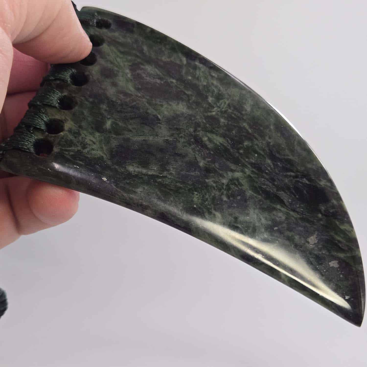 Douglas Creek Pounamu is known for its dramatic dark greens, blacks, and swirling patterns. This piece showcases all of those qualities, giving the Niho a bold and natural energy that suits the scale of the taonga.