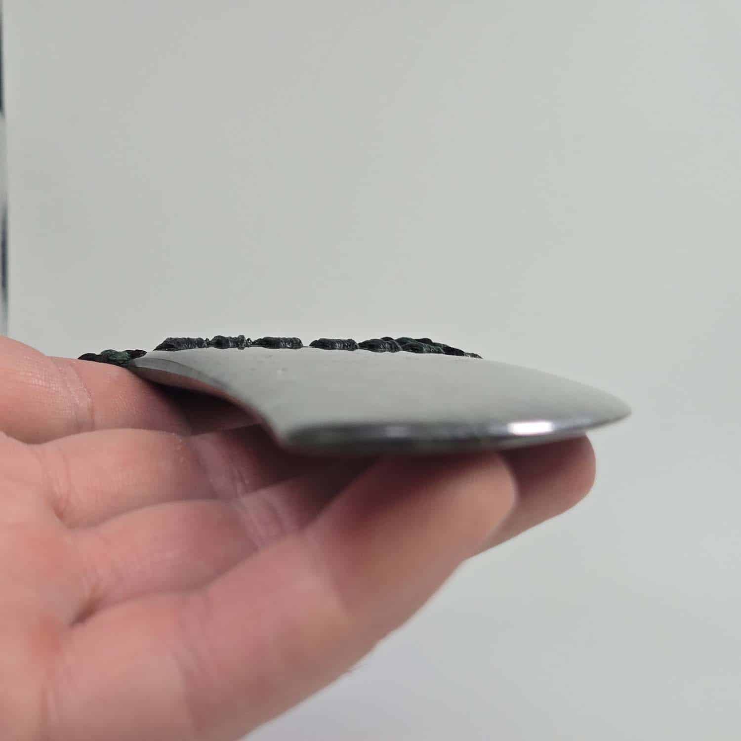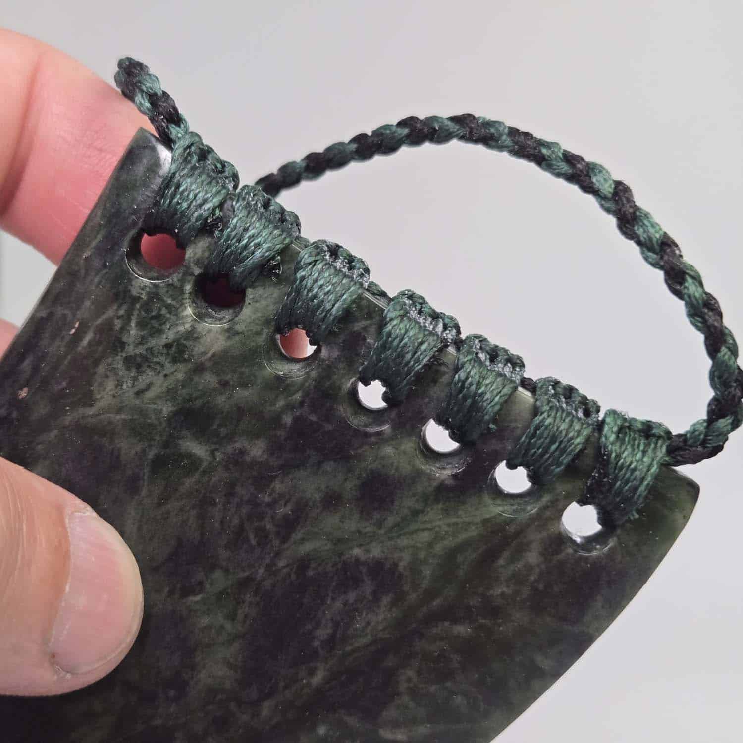 Across the top is a seven-hole ring-bolt lashing, strong and balanced, holding the form securely. The cord is a deep forest-green and black braid, chosen to match the tones that run through this piece of TÄkiri Pounamu. Completing it is a toggle carved by Paul from the same stone, keeping the whole taonga connected from end to end in one unified story.