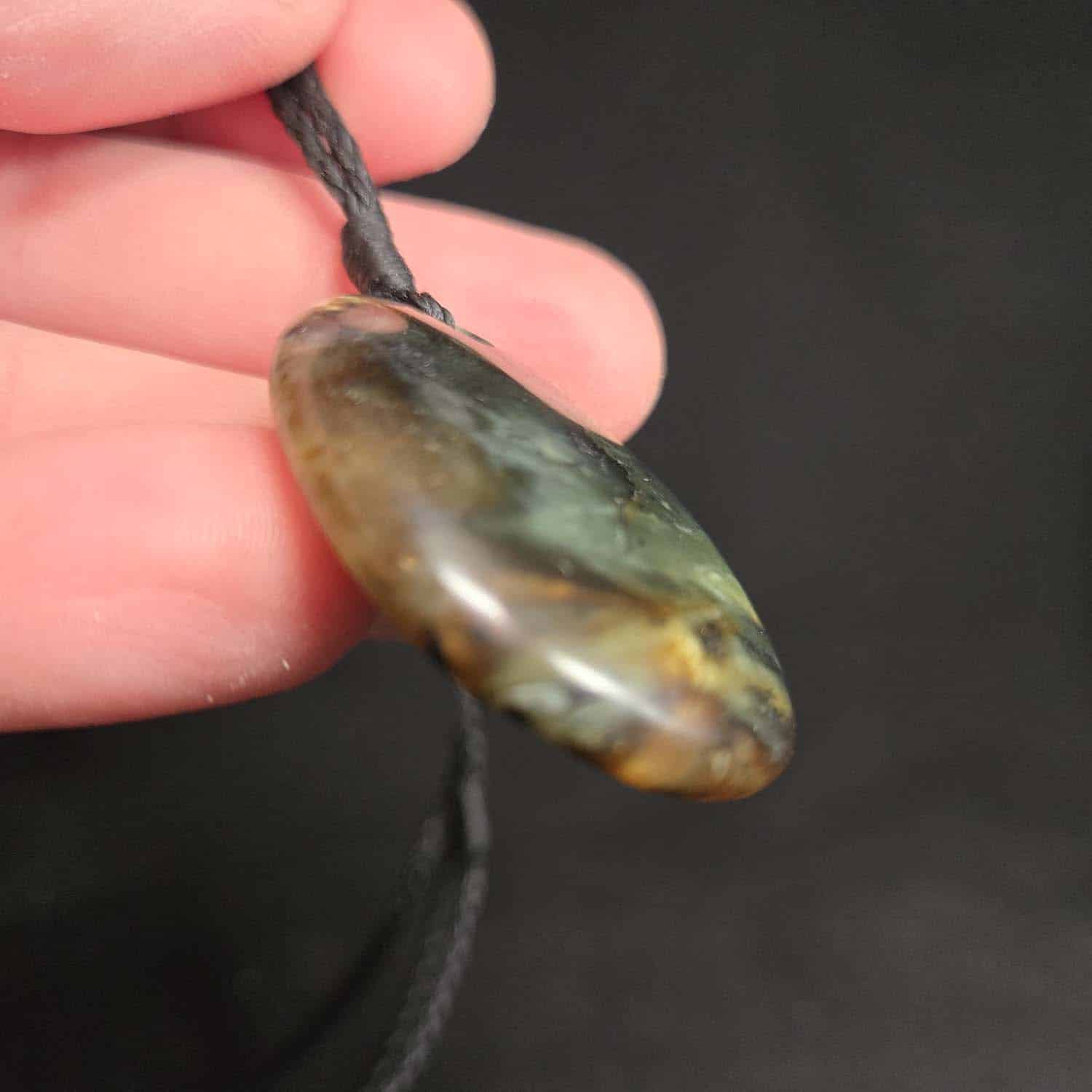 Suspended from a single hole on a black cord, this taonga feels grounded and strong, with a gentle radiance that shifts as you move.