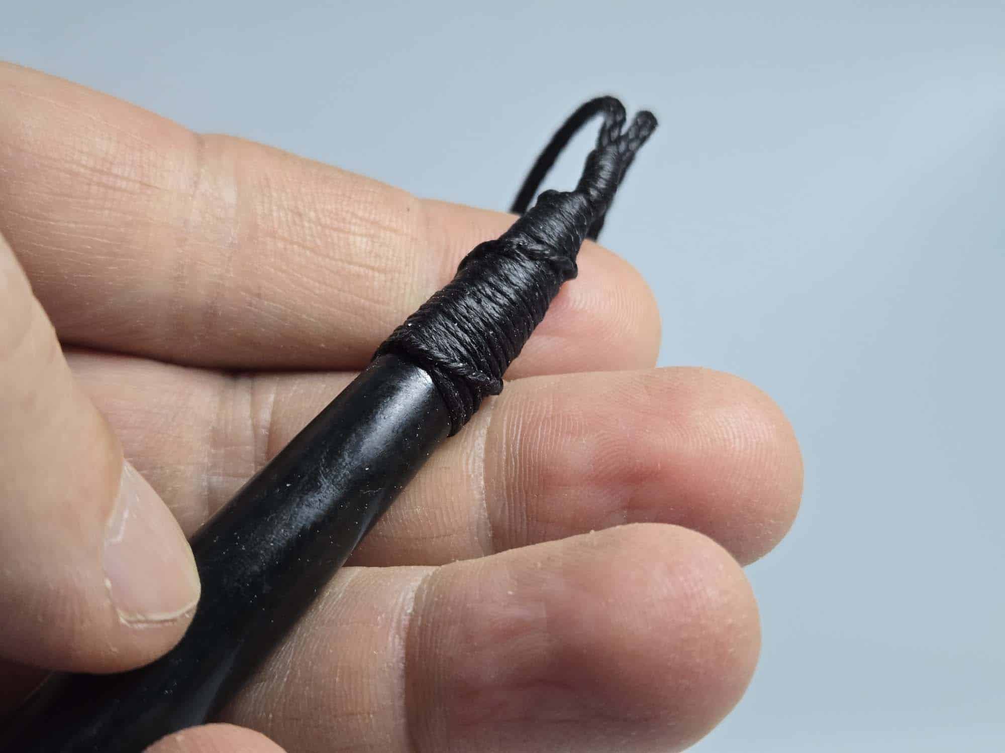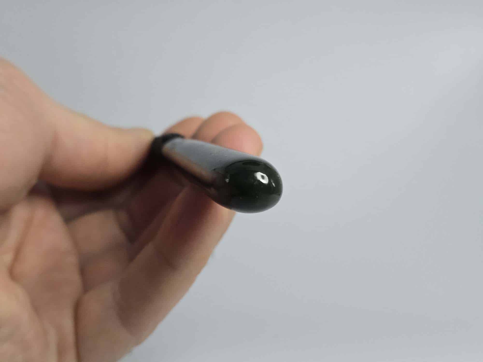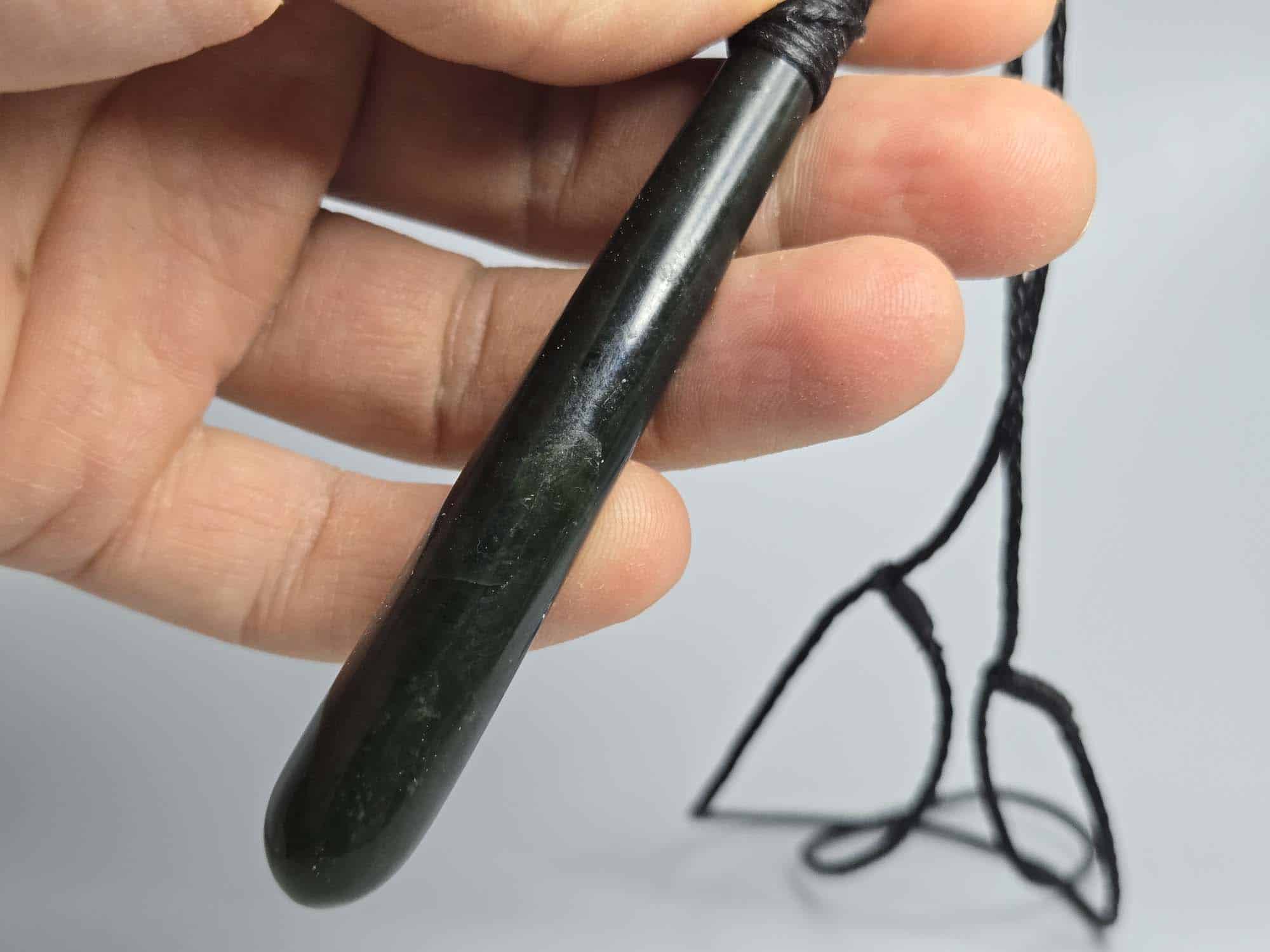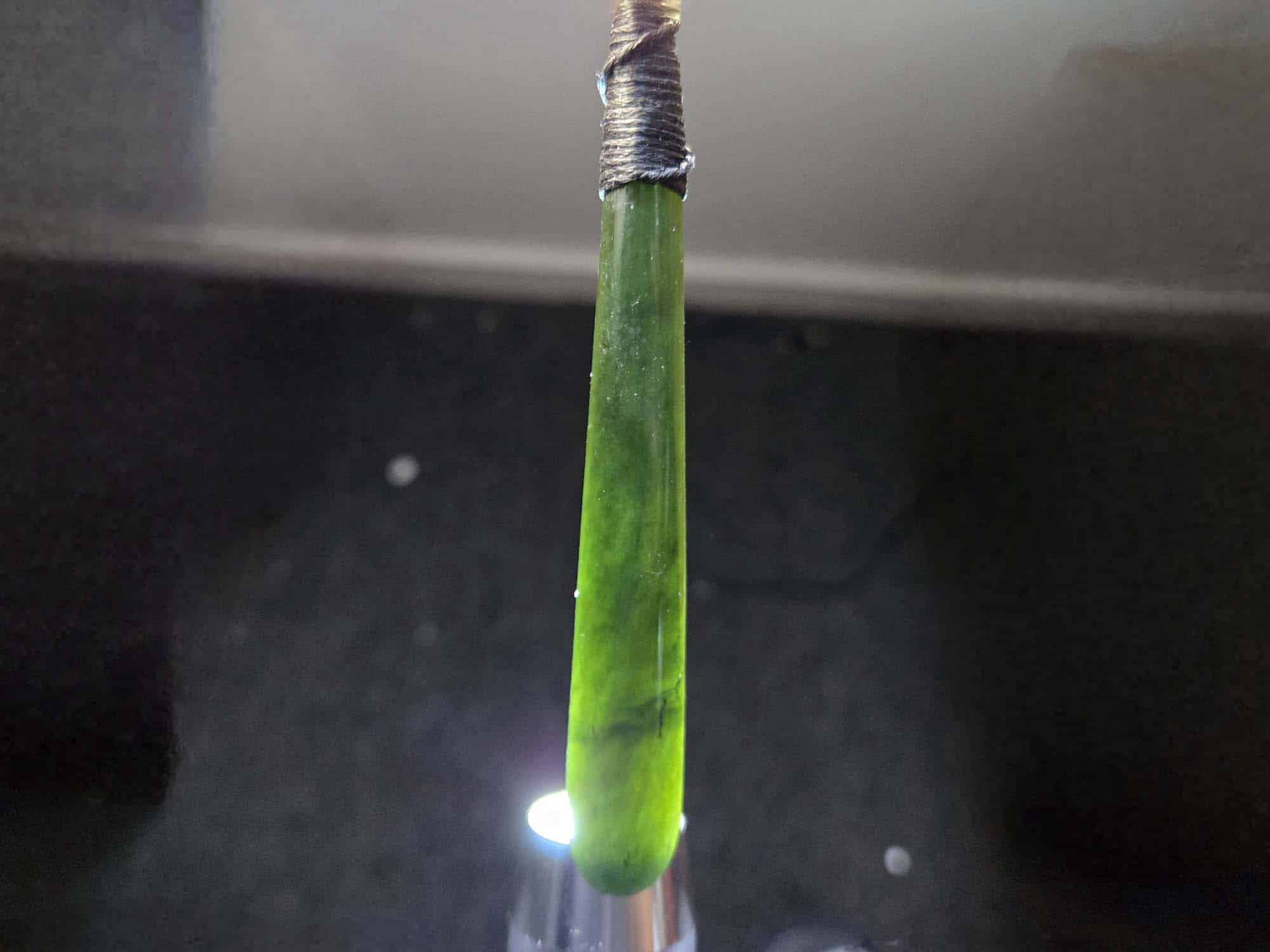 Carved from Tangiwai Pounamu, the most translucent form of Pounamu, this piece glows with a gorgeous inner light when lifted to the sun. The stone is dark green with a very fine clear grain, drawing the eye into its depth and clarity. Finished with a black spiral lashing, the design is both strong and elegant, highlighting the beauty of the stone.