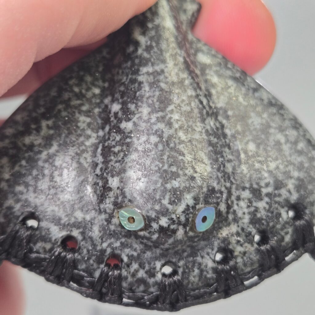 The pāua shell eyes bring the piece to life. They catch the light and shift in colour, adding another layer of movement and presence. They draw attention to the head of the whai, reinforcing its sense of direction and awareness.