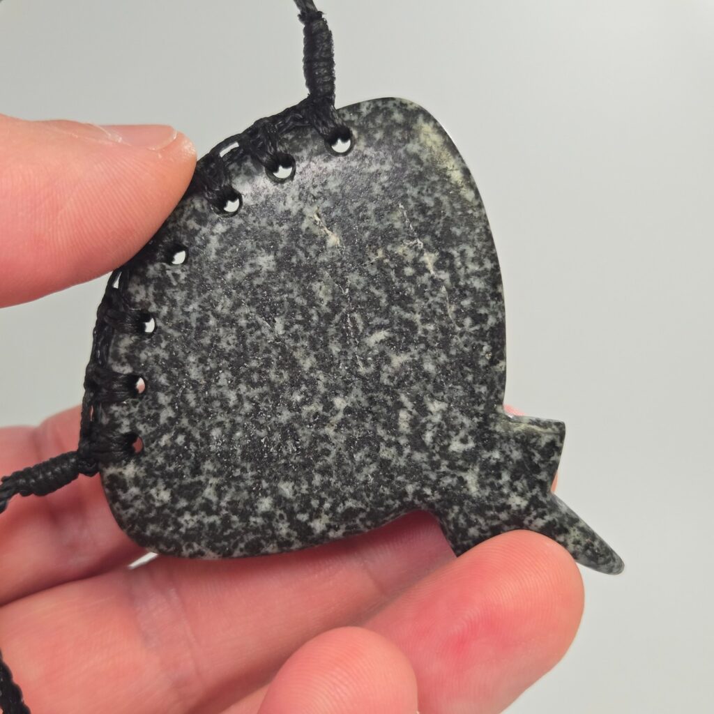The stone is a dark grey syenite, a coarse-grained igneous rock formed deep within the earth as molten material slowly cooled. Over time it has been weathered and carried down through the river system, eventually resting in the Rakahuri. Its natural patterning, a deep grey base scattered with lighter mineral speckles, gives the surface a textured, almost shifting appearance. That movement in the stone suited the whai form well, echoing the way a stingray moves through water.