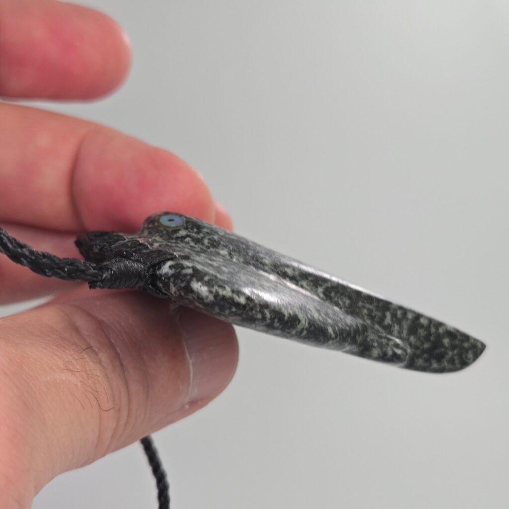 The shape is a whai, carved swimming upward rather than hanging downward. This changes the feel of the piece. Instead of resting, it is moving, rising, navigating its path. The whai is often associated with protection, awareness, and quiet strength. It moves calmly but with purpose, reading its environment and responding with precision. In this piece, that meaning sits alongside the idea of grounding in place while still moving forward in life.