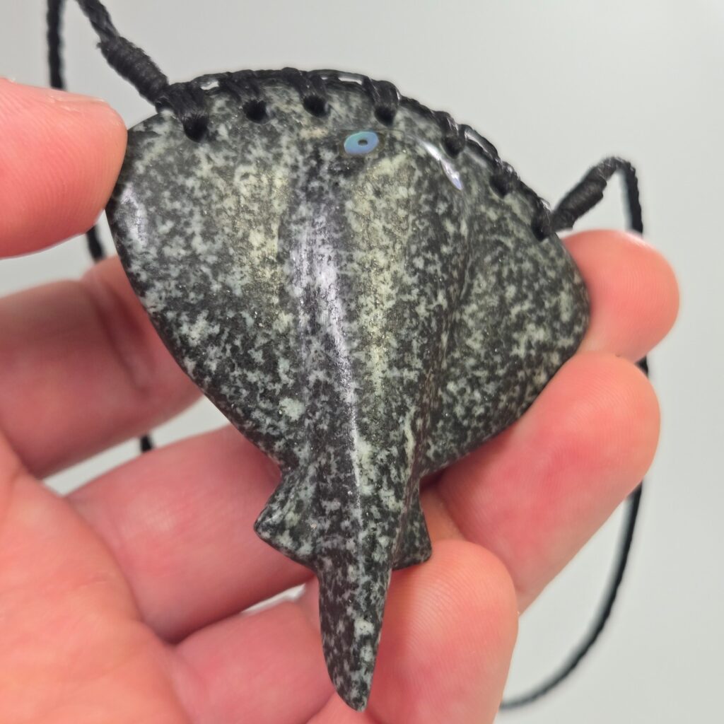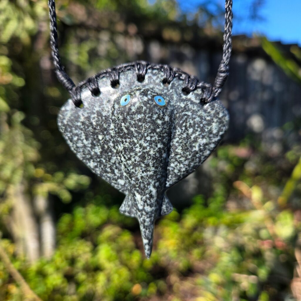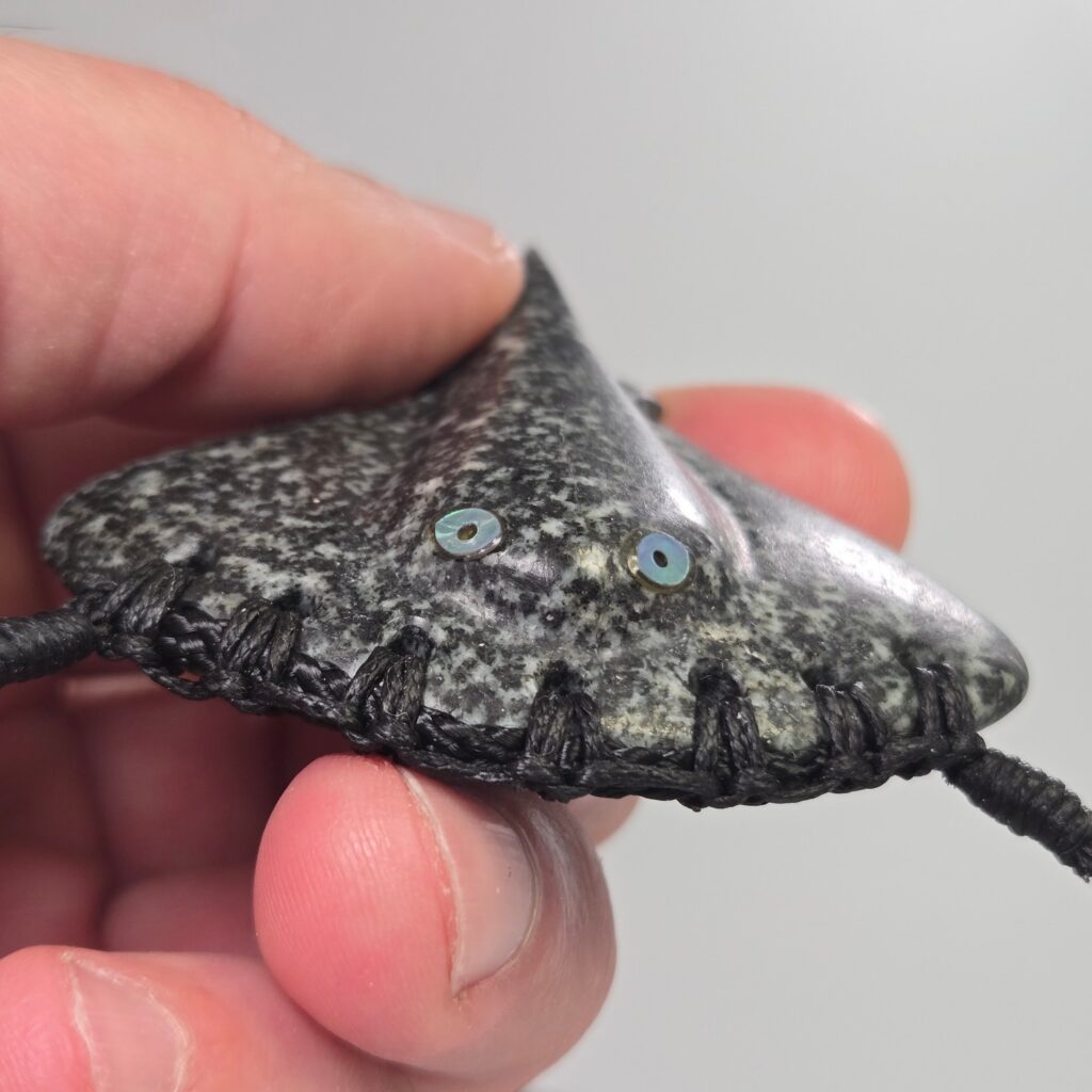 This taonga is a 65mm whai (stingray) carved from stone gathered from the Rakahuri (Ashley River) in North Canterbury. It carries a strong sense of place, shaped not just by the stone itself, but by the connection the recipient has to that river, to Maukatere, and to the wider Hurunui landscape.