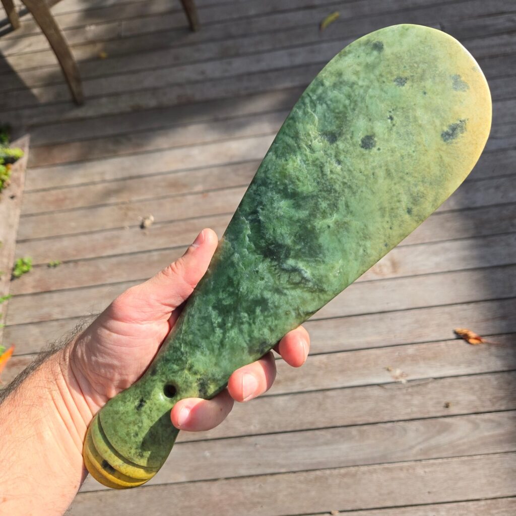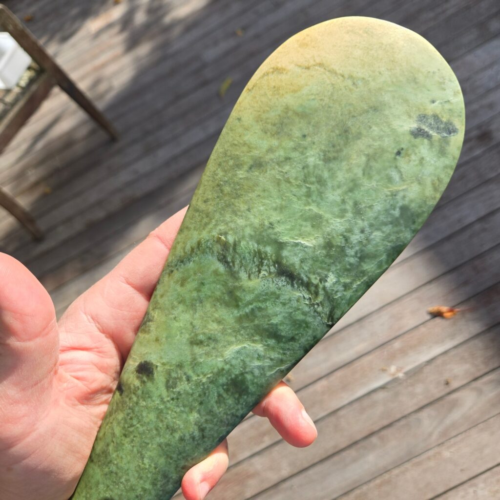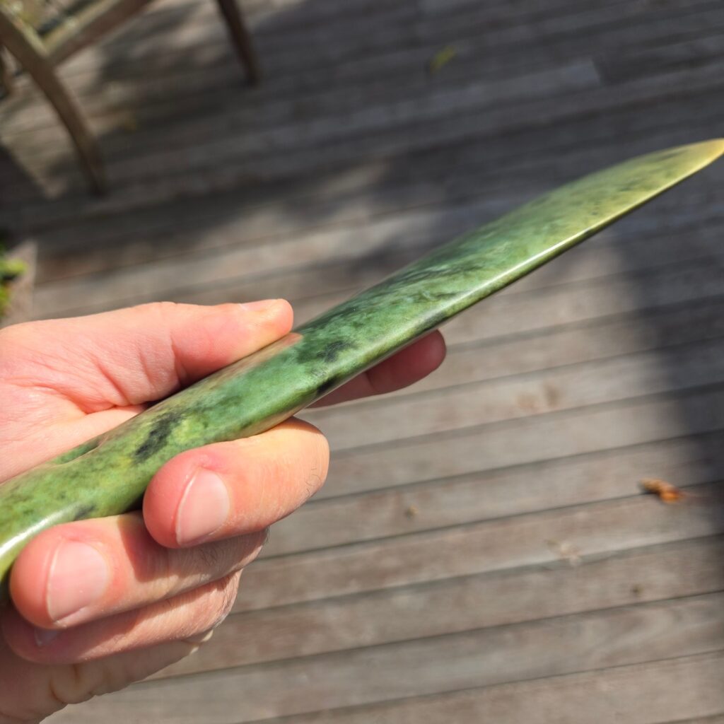 He already owns a Mere, and the idea with this one was to create a replica in a different type of Pounamu so the two could be compared side by side. Same form, same intent — but letting the stone show its own character.