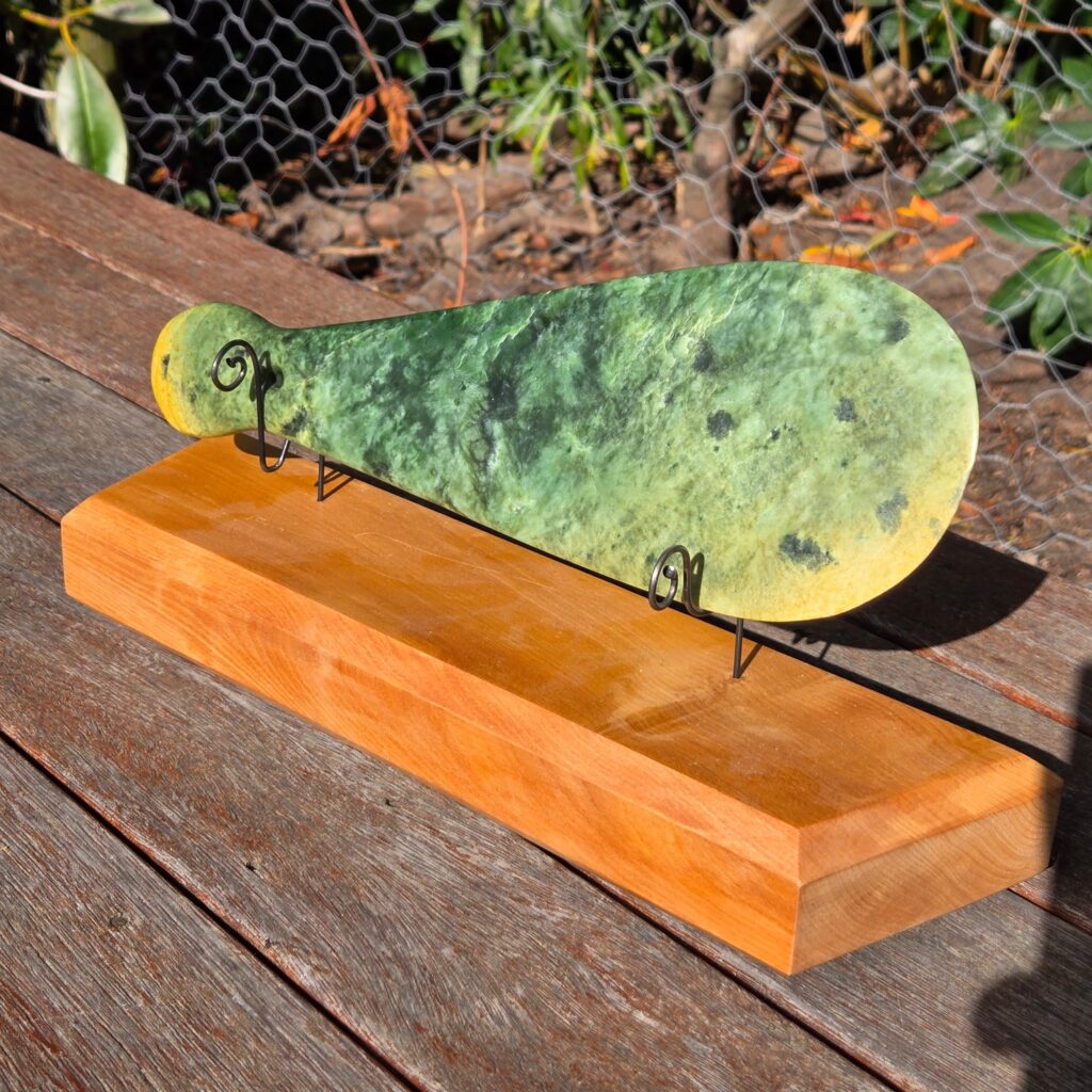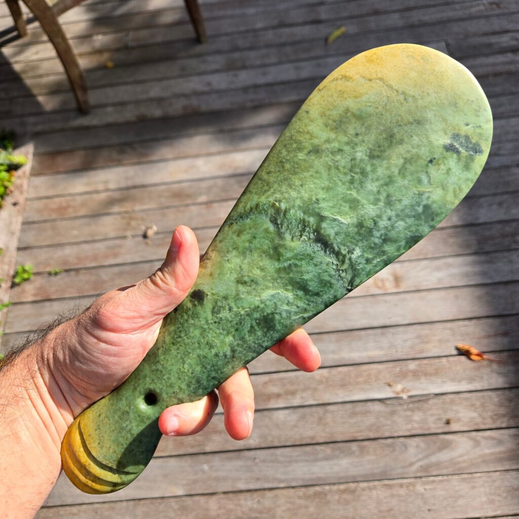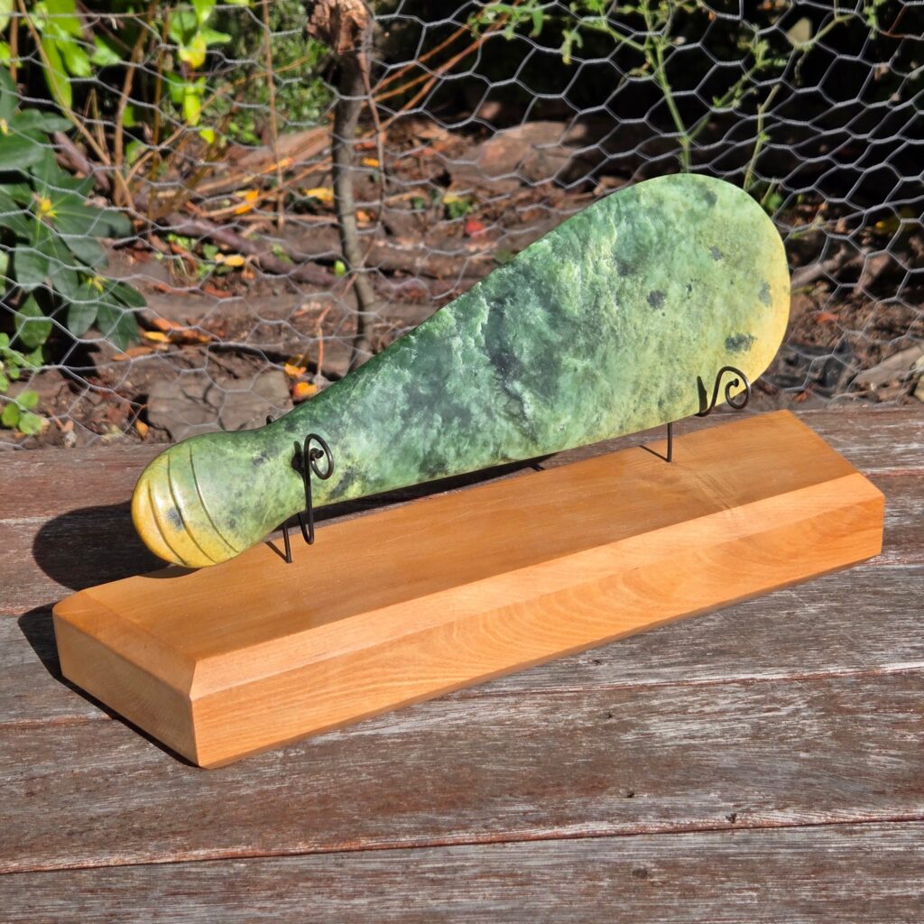 He already owns a Mere, and the idea with this one was to create a replica in a different type of Pounamu so the two could be compared side by side. Same form, same intent — but letting the stone show its own character.